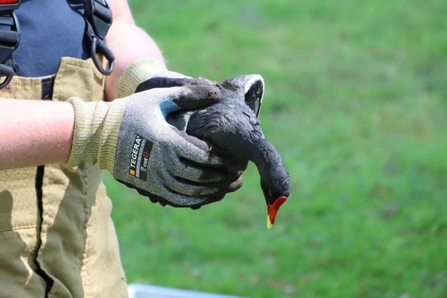 Rond het middaguur werd de dierenambulance gealarmeerd voor de twee vogels in de sloot. Omdat de meerkoeten diep in de duiker zaten en er geen beweging in te krijgen was, werd de hulp van de brandweer ingeschakeld. Door enkele bouten van het rooster los te draaien, ontstond er net genoeg ruimte om de dieren met een schepnet te bereiken.