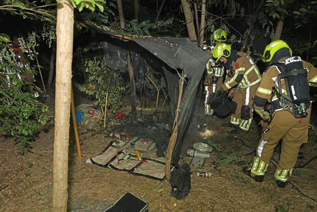In een stuk bos stond een zelfgemaakte slaapplek met spullen in brand. Vermoedelijk ging het om het onderkomen van een dakloze. Ook werden meerdere kledingstukken aangetroffen die aan takken in het bos hingen.
