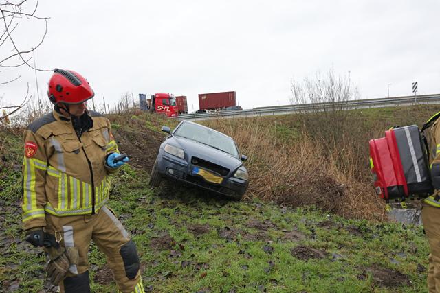 De brandweer werd met spoed gealarmeerd omdat de auto op een instabiele plek stond. Men vreesde dat het voertuig alsnog de naastgelegen sloot in zou rollen. Brandweerlieden hebben de situatie veiliggesteld en het voertuig gecontroleerd. De bestuurder wist ondertussen zelfstandig en ongedeerd uit de auto te klimmen.