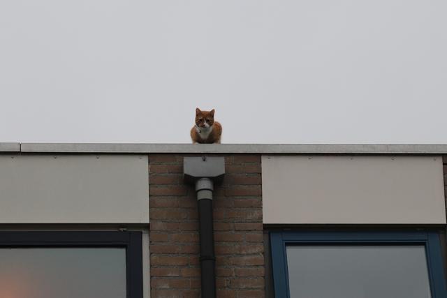 Op het dak zat er een kat. Toen de brandweer er met de hoogwerker aankwam, en bijna alles gereed had gemaakt om de kat te redden, besloot het beestje via de achterzijde van de woning er zelf maar naar beneden te komen.