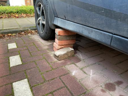 Bij een geparkeerde auto was er de katalysator er onderuit gehaald. Door enkele bakstenen te plaatsen onder de auto is het de dader(s) gelukt om de katalysator er onderuit te krijgen.