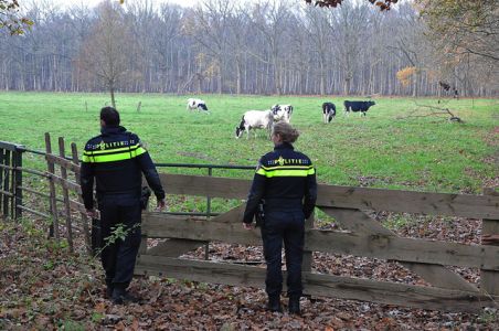 Omstanders zagen midden in de bossen een koe loslopen. De politie wist de koe op te sporen. De slimme koe hoorde waarschijnlijk de politie al aankomen en nam een aanloop en sprong over een hek terug de wei in.