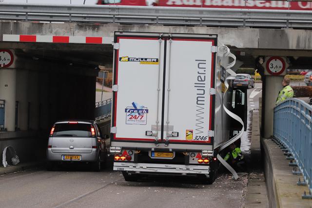 Weer staat er onder het berucht viaduct een vrachtwagen vast. Rijkswaterstaat en de politie hebben de weg afgesloten voor al het verkeer. De vrachtwagen staat muur vast.
